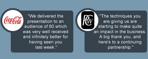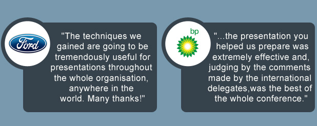 "The two days we had with you were, simply put, life-changing. Not only did I gush about your presentation expertise and training to anyone that would listen, I also immediately applied some of the techniques when reviewing an important presentation the following two days. The second point surprised me - I have been on a few great trainings but always worry about how much I will actually incorporate into my daily way of working once I leave the 'training bubble'. I did honestly wonder on Day 1 with you the same thing, and therefore am even more shocked at how much your training stuck with me. Not only me, but I have seen the changes in the others as well and it's actually quite inspiring.